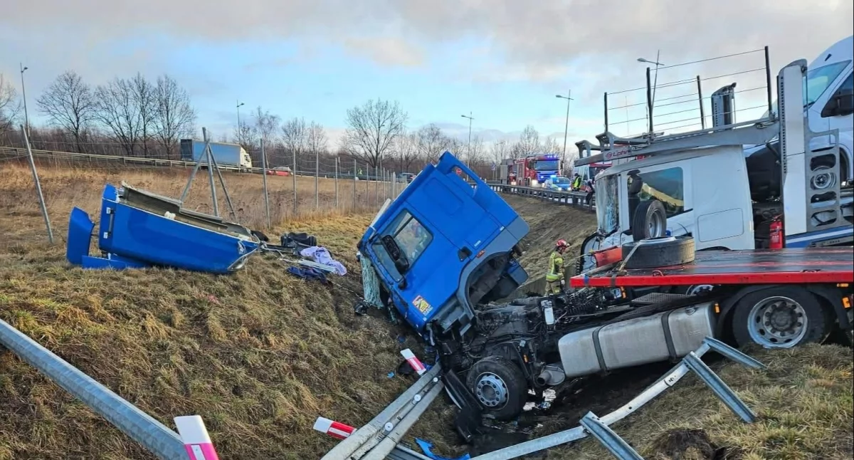 Wypadek ciężarówek na węźle Krzywa. Trzy ciężarówki w rowie i ogromne utrudnienia w ruchu