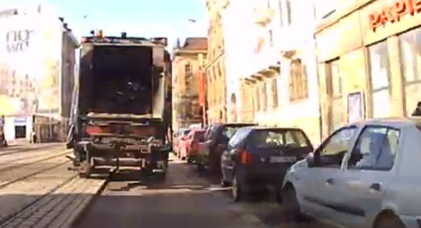 Z jednej strony torowisko tramwajowe, z drugiej zaparkowane samochody. Kierowca śmieciarki nie ma więc wielkiego wyboru. Musi częściowo jechać torowiskiem. Jeśli w tym czasie pojawi się tam tramwaj dojdzie albo do zablokowania ruchu albo w końcu do kolizji.