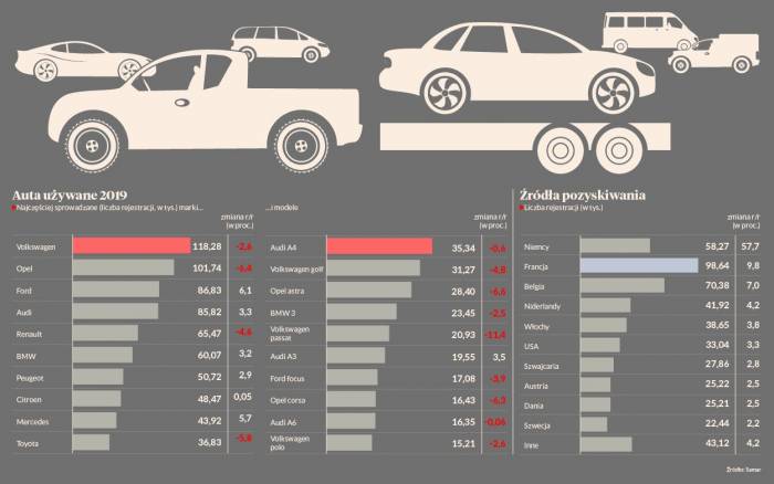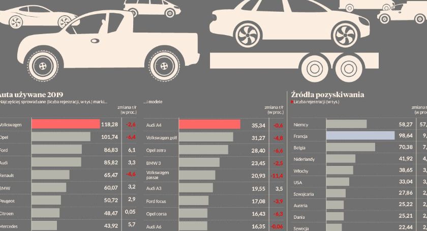 Średni wiek kupionego za granicą i zarejestrowanego w Polsce auta używanego wynosił 11 lat i 11 miesięcy. Najczęściej (86,5 tys. razy) rejestrowano auta z 2008 r. Liderem na liście ulubionych używanych marek jest Volkswagen. W 2019 r. aut z logo tego producenta przybyło 118,3 tys. Najczęściej rejestrowanym modelem jest audi A4 — wydano tablice dla ponad 35,3 tys. sztuk. Dla porównania: w 2019 r. zarejestrowano w Polsce 13,8 tys. wszystkich nowych modeli tej marki. Największą aktywność w poszukiwaniu i rejestrowaniu aut z zagranicy wykazali mieszkańcy Wielkopolski (125, 5 tys. rejestracji), najmniej (27,8 tys.) zarejestrowano ich w województwie opolskim, mimo że właśnie tu nastąpił najbardziej dynamiczny procentowy wzrost rejestracji w ciągu roku (+4,4 proc.). Największy spadek importu zanotowano w województwie podkarpackim (60,4 tys. aut, -2,6 proc.).