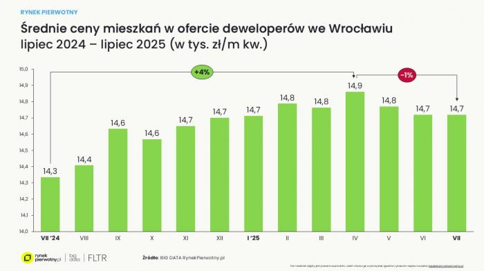 Warto przypomnieć, że w 2024 r. średnia cena ofertowa metra kwadratowego nowych mieszkań we Wrocławiu wzrosła aż o 12%. Tym samym stolica Dolnego Śląska zwyciężyła w wyścigu o miano lidera podwyżek cen mieszkań wśród siedmiu największych metropolii. Jak tłumaczy Marek Wielgo, ekspert portalu RynekPierwotny.pl - Wrocław był też jedyną, w której na przestrzeni ostatnich sześciu lat średnia cena metra kwadratowego mieszkań na rynku pierwotnym rosła w dwucyfrowym tempie. A jak jest w 2025 r. Średnia pięła się w górę aż do kwietnia, kiedy to osiągnęła pułap 14,9 tys. zł. W tym okresie zdarzały się okresy stabilizacji, ale dopiero w drugim kwartale odnotowaliśmy delikatny spadek średniej ceny metra kwadratowego do ok. 14,7 tys. zł.