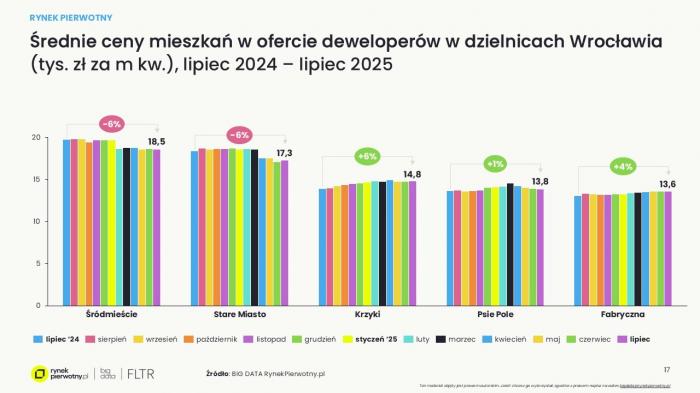 Ci, którzy planują w tym roku zakup mieszkania w najtańszych rejonach Wrocławia mogą się wprawdzie cieszyć z większego wyboru, ale powinni się też liczyć z większym wydatkiem – tłumaczył ekspert portalu RynekPierwotny.pl. W dzielnicy Krzyki średnia cena metra kwadratowego mieszkań w ofercie firm deweloperskich poszła w górę w ciągu ostatnich 12 miesięcy o 6%, z czego tylko w tym roku – o 2%. Z kolei w dzielnicy Fabryczna wzrost średniej rok do roku wyniósł 4%, ale jest to głównie zasługą ostatnich siedmiu miesięcy. Pamiętajmy jednak, że jest to duży obszar miasta, w którym też są lepsze i gorsze lokalizacje. Na pewno w bardziej komfortowej sytuacji są ci, którzy mogą sobie pozwolić na zakup mieszkania w Śródmieściu czy Starym Mieście. Czas grał bowiem na korzyść potencjalnych nabywców w tych dzielnicach Wrocławia. Średnia cena metra kwadratowego jest tam niższa niż przed rokiem o 6%. Przy czym jej spadek nastąpił tak naprawdę dopiero w tym roku. Podobna sytuacja ma miejsce w dzielnicy Psie Pole, w której zjazd cen zaczął w kwietniu i w lipcu osiągnął wartość minus 5%.