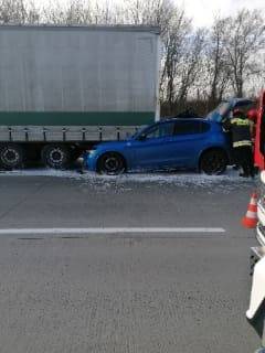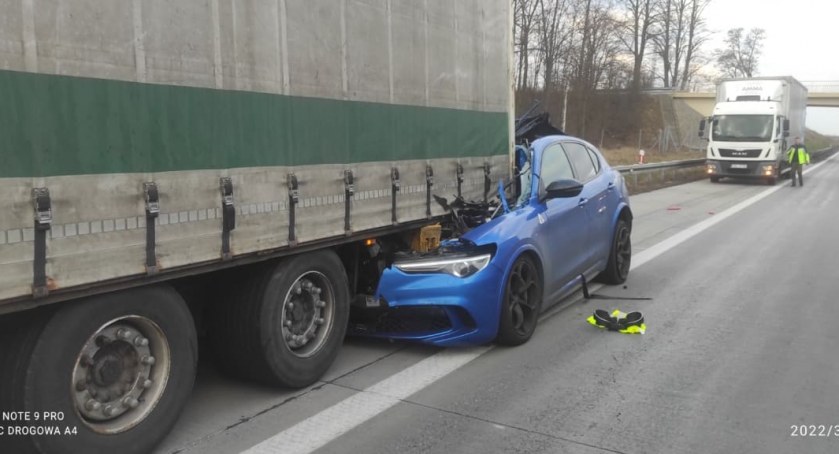 Na 103 km autostrady A4 jadąc od Legnicy w stronę Wrocławia samochód osobowy marki Alfa Romeo z impetem wbił się w naczepę ciężarówki. Siła uderzenia była tak duża, że samochód do połowy znajduje się pod naczepą. Kierowca cudem uniknął śmierci.