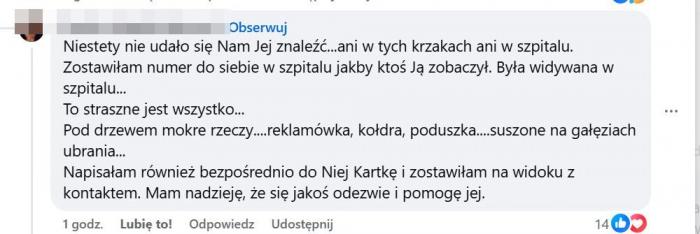 W komentarzach pojawiają się kolejne osoby — ktoś niesie koce, ktoś termos, ktoś chce zawieźć ciepły posiłek. Ktoś inny mówi: „Jak ją zobaczysz, dzwoń. Przyjadę od razu”.