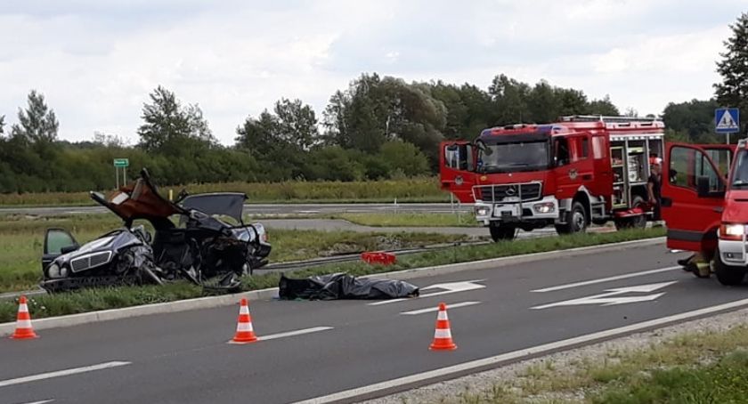 Samochód osobowy zderzył się z tam ciężarówką. Jak ustaliła policja, osobowy Mercedes jadący od strony Mrozowa, zderzył się z ciężarówką, która poruszała się drogą główną. W wyniku tego zdarzenia zginął kierowca osobówki, a pasażer został zabrany śmigłowcem do szpitala w ciężkim stanie.