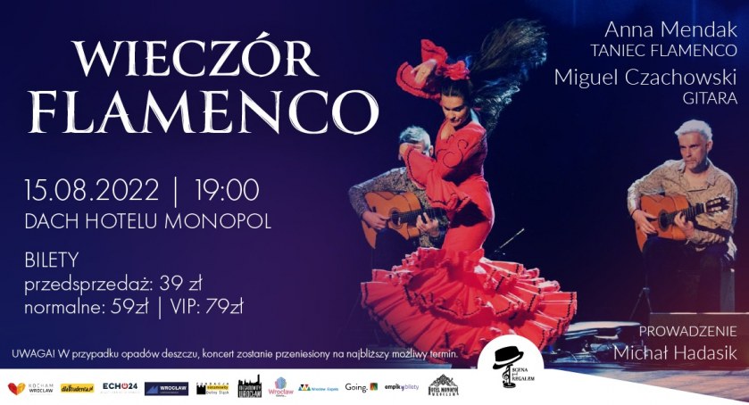 Ta dwójka to absolutna ścisła, europejska czołówka artystów promujących na całym świecie muzykę i taniec Flamenco. W blasku zachodzącego słońca, na dachu Hotelu Monopol można będzie zatopić się w ich dźwiękach oraz podziwiać talent taneczny Anny Mendak. To wszystko skąpane w pięknych okolicznościach architektonicznych z widokiem na cały Wrocław! Barmani Hotelu zadbają również o Wasze podniebienia serwując Wam najlepsze cocktaile w mieście! To będzie niezapomniany wieczór Flamenco we Wrocławiu! Koniecznie zabierzcie znajomych i przybywajcie na taras 4 Hotelu Monopol już 15 sierpnia o 19:00