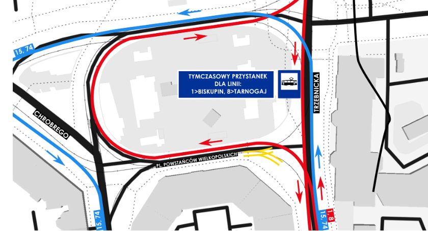 – Tramwaje linii 1 w kierunku pętli BISKUPIN i 8 w kierunku pętli TARNOGAJ nie będą jeździły wokół placu Powstańców Wielkopolskich. Przystanek "Dworzec Nadodrze" zostanie dla nich przeniesiony w tymczasową lokalizację – na ul. Trzebnicką. Wysiadanie i wsiadanie na przystanku tymczasowym będzie odbywało się z jezdni, w związku z czym prosimy o zachowanie ostrożności. W przeciwnym kierunku linie 1 i 8 będą kursowały swoimi stałymi trasami.