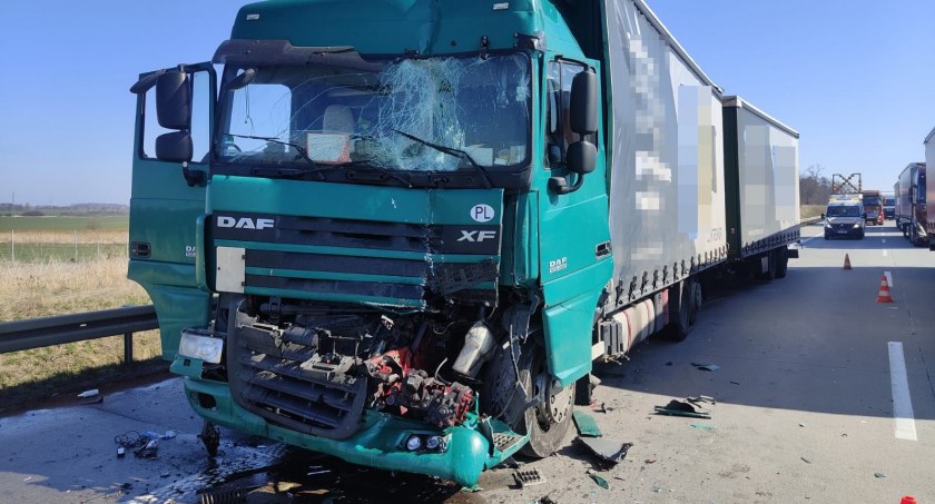 Według wstępnych ustaleń mężczyzna kierujący pojazdem ciężarowym marki DAF, nie zachował należytej odległości od poprzedzającego go innego pojazdu ciężarowego, w wyniku czego uderzył w jego tył. Uderzony pojazd ciężarowy najechał na tył kolejnej ciężarówki. Sprawca wypadku trafił do szpitala.