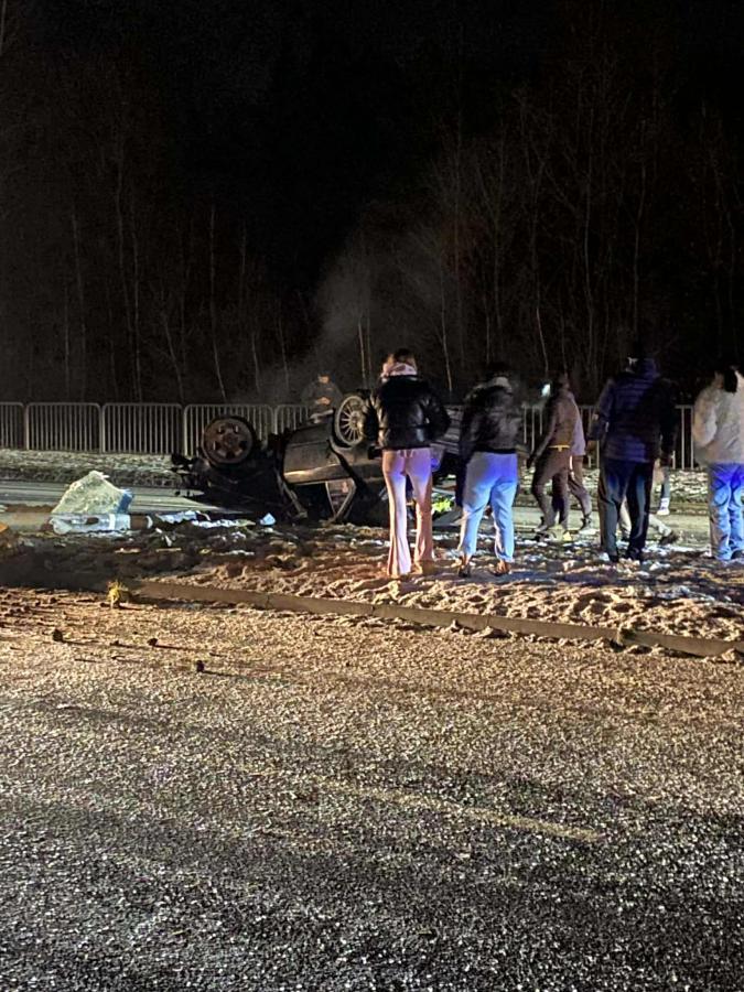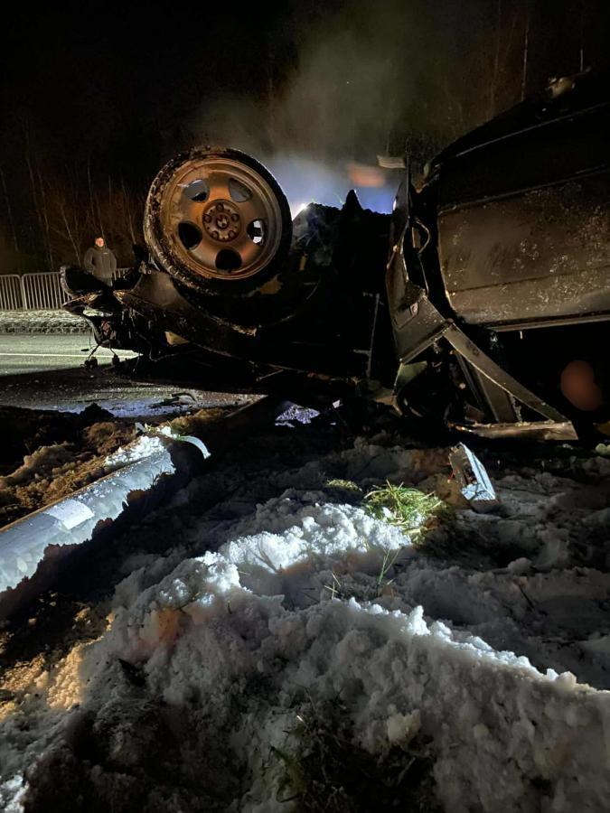 Kierowca BMW stracił panowanie, uderzył w latarnie i dachował. Trzy osoby uwięzione w pojeździe. Na miejscu pracują służby