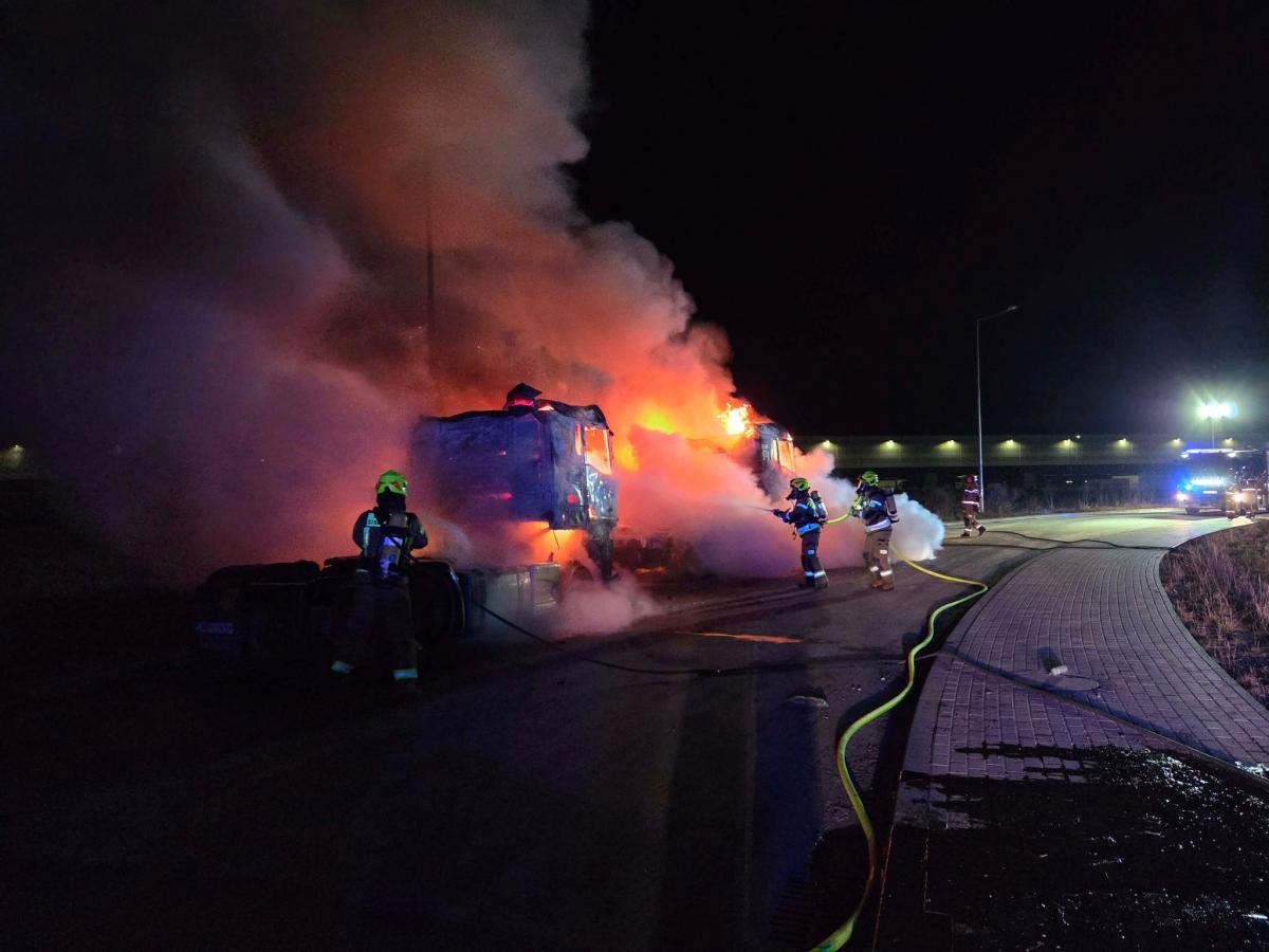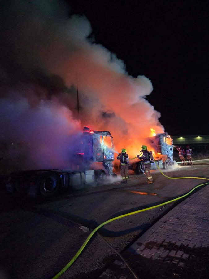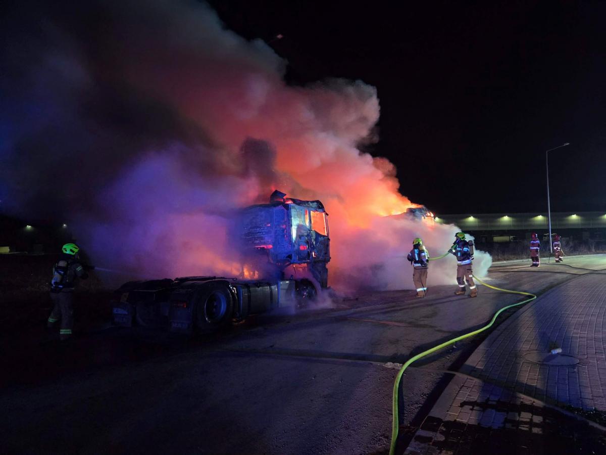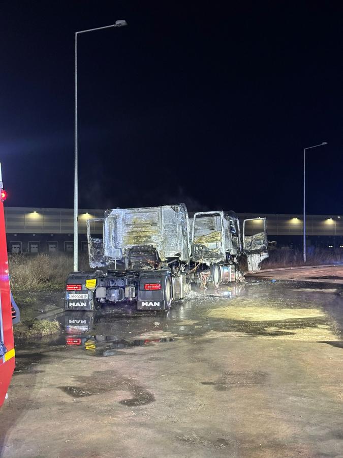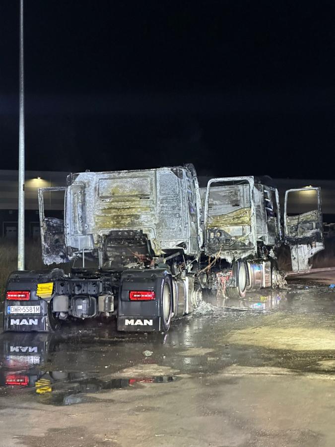 Nocny pożar w Dobrzykowicach. Spłonęły dwa pojazdy ciężarowe