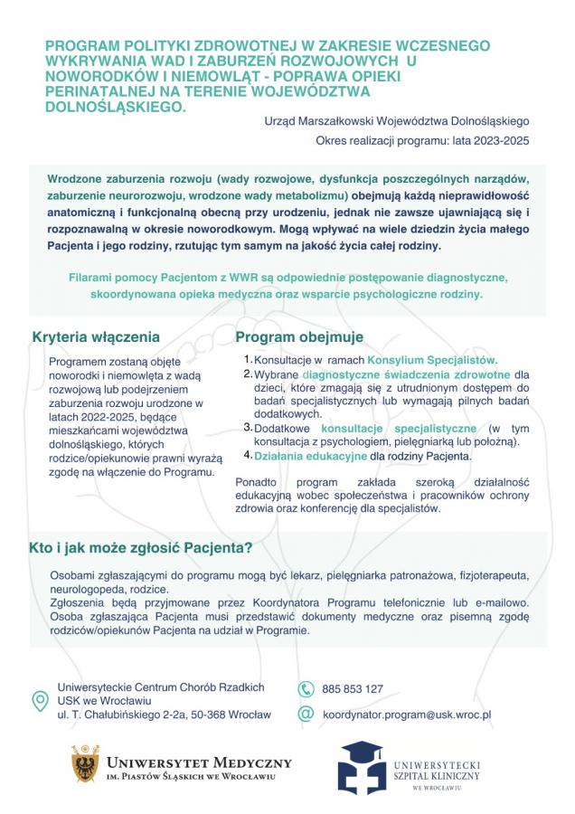 Program diagnostyczny dla dzieci - galeria zdjęć Program diagnostyczny dla dzieci prowadzony przez Uniwersytecki Szpital Kliniczny to innowacyjna inicjatywa, która ratuje życie i zdrowie najmłodszych pacjentów. Dzięki szybkiej diagnozie i kompleksowej opiece specjalistów, dzieci z rzadkimi chorobami genetycznymi mają szansę na normalny rozwój. Zespół kliniczny zrealizował już wiele konsultacji lekarskich, psychologicznych oraz badań diagnostycznych, co przyczynia się do skuteczności programu. Historie takie jak ta Leona, chłopca z achondroplazją, to tylko jeden z przykładów sukcesu. Program nadal jest dostępny dla dzieci zamieszkałych na Dolnym Śląsku, niezależnie od historii leczenia. Zgłoszenia są przyjmowane bez skierowania, wystarczy wysłać e-mail z informacjami o dziecku. Dzięki temu inicjatywa może dotrzeć do większej liczby osób i poprawić jakość opieki zdrowotnej dla najmłodszych.