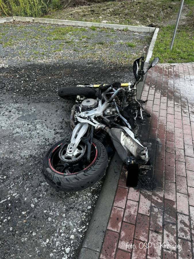 Zdjęcia Śmierć motocyklisty w Krzywej. Najechał na próg zwalniający i uderzył w drzewo. Jego motocykl stanął w płomieniach - fotorelacja